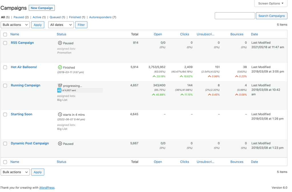 If all newsletters have been sent, the campaign is “finished” and the date shows when the campaign has been finished.