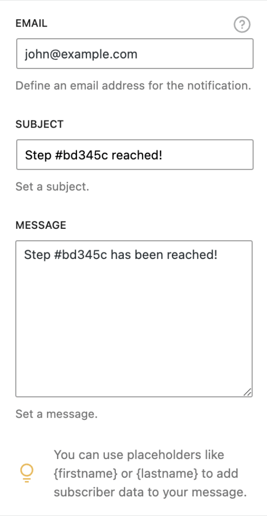Define a subject and write a message to clarify it in your inbox. You can use placeholder tags like {firstname} or {lastname} to insert the values of the current user from the notification.