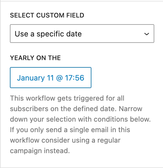 Run a workflow on the anniversary of your subscribers, like birthdays or membership dates. If you would like to start a workflow on a specific date (and not on the anniversary of that date) check the Specific date Trigger.
