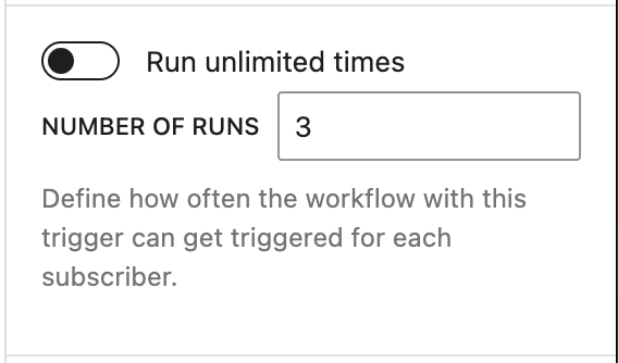 You can define how often the workflow can get triggered for each subscriber. Either define a specific number or choose “unlimited” to allow to trigger the workflow without any limits.