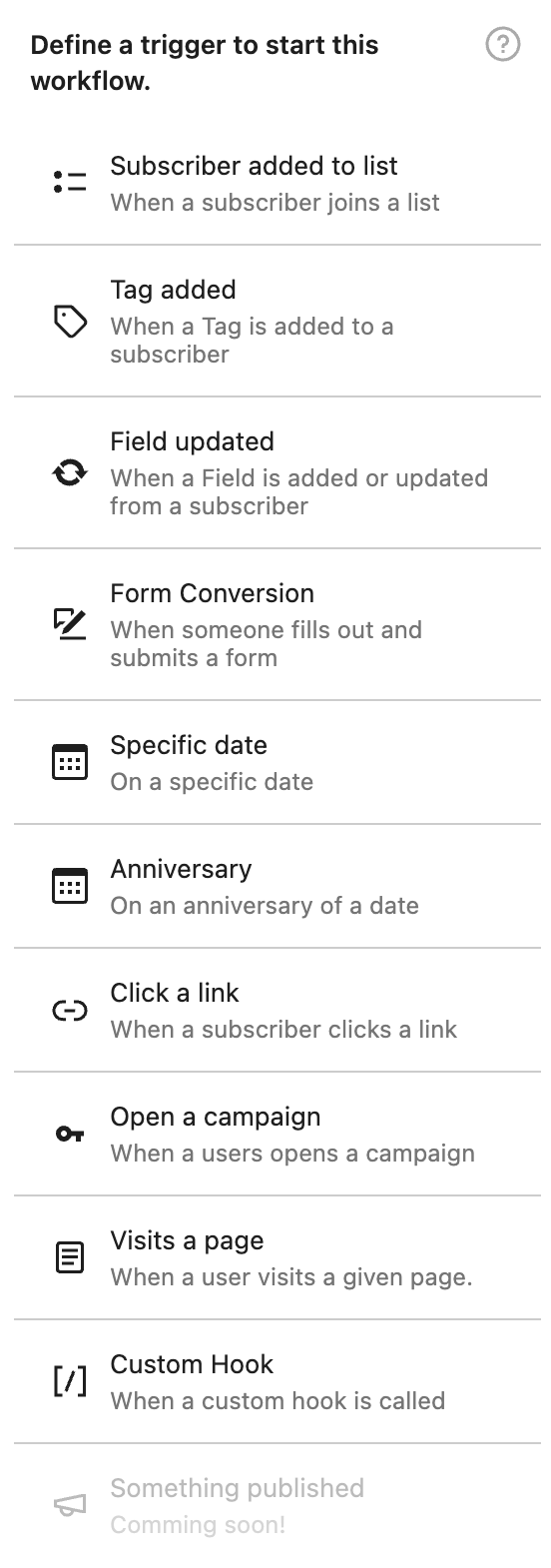 Creating a new workflow requires a “trigger” which initiates the workflow. Each workflow can have up to 5 triggers.