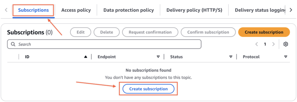 Click on the newly created topic and find the “Subscriptions” tab. Create a new subscription.