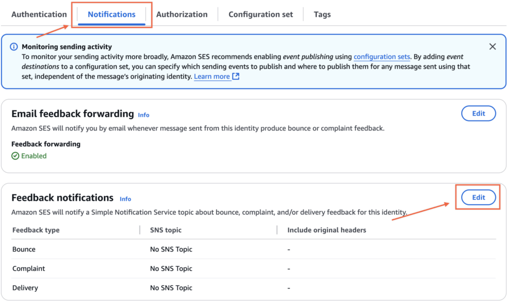Click on the Identity you like to add SNS Notifications and find the “Notifications” tab.