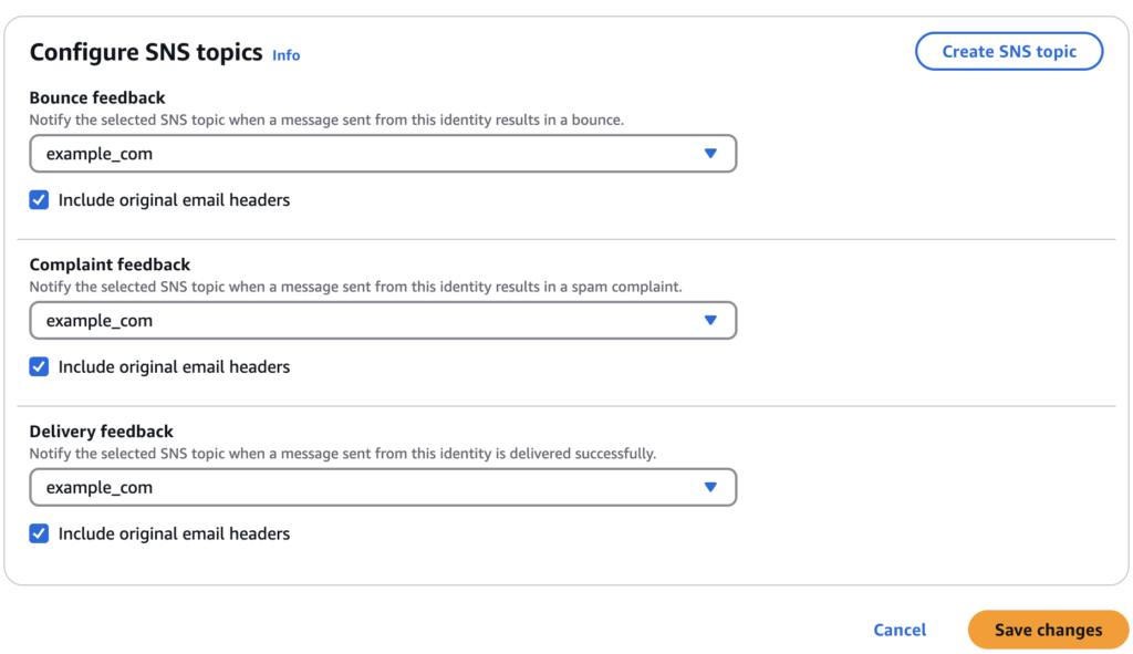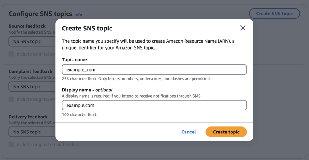 Now we have to create and assign a new topic. Let’s head over to the Amazon SNS service to decide what should be done if a bounce or complaint happens.