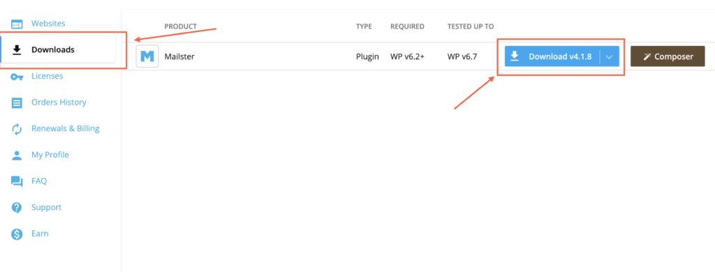 Once you log into your Freemius account here you can head over to “Downloads” and click th button next to the Mailster plugin.
