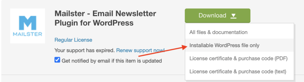 Head over to the download section and find the Mailster Newsletter plugin. Click on “Download” and choose “Installable WordPress file only”.