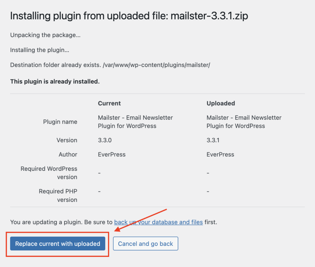 Once the plugin is updated you will get asked if you like to replace the existing one. Click on “Replace current with uploaded” to continue.