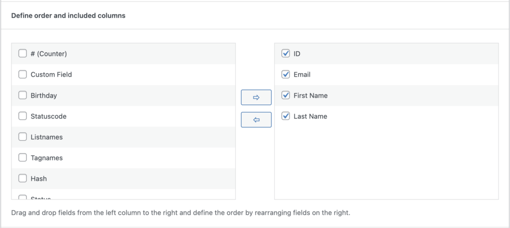 Define which fields you like to export. You can also define the order of each column by dragging fields around.