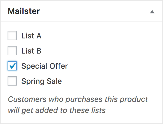 You can also add subscribers to certain lists if they purchase a specific item. You can find this option on the product edit page on the right side.