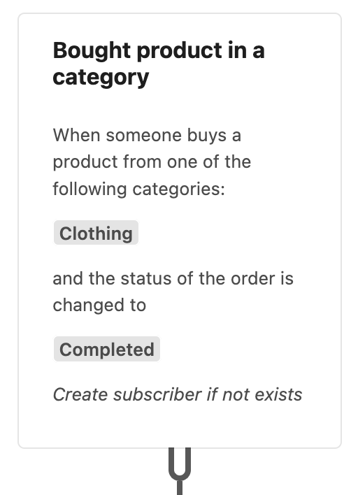 This trigger is used to run a workflow once a user buys a product from one or more product categories.