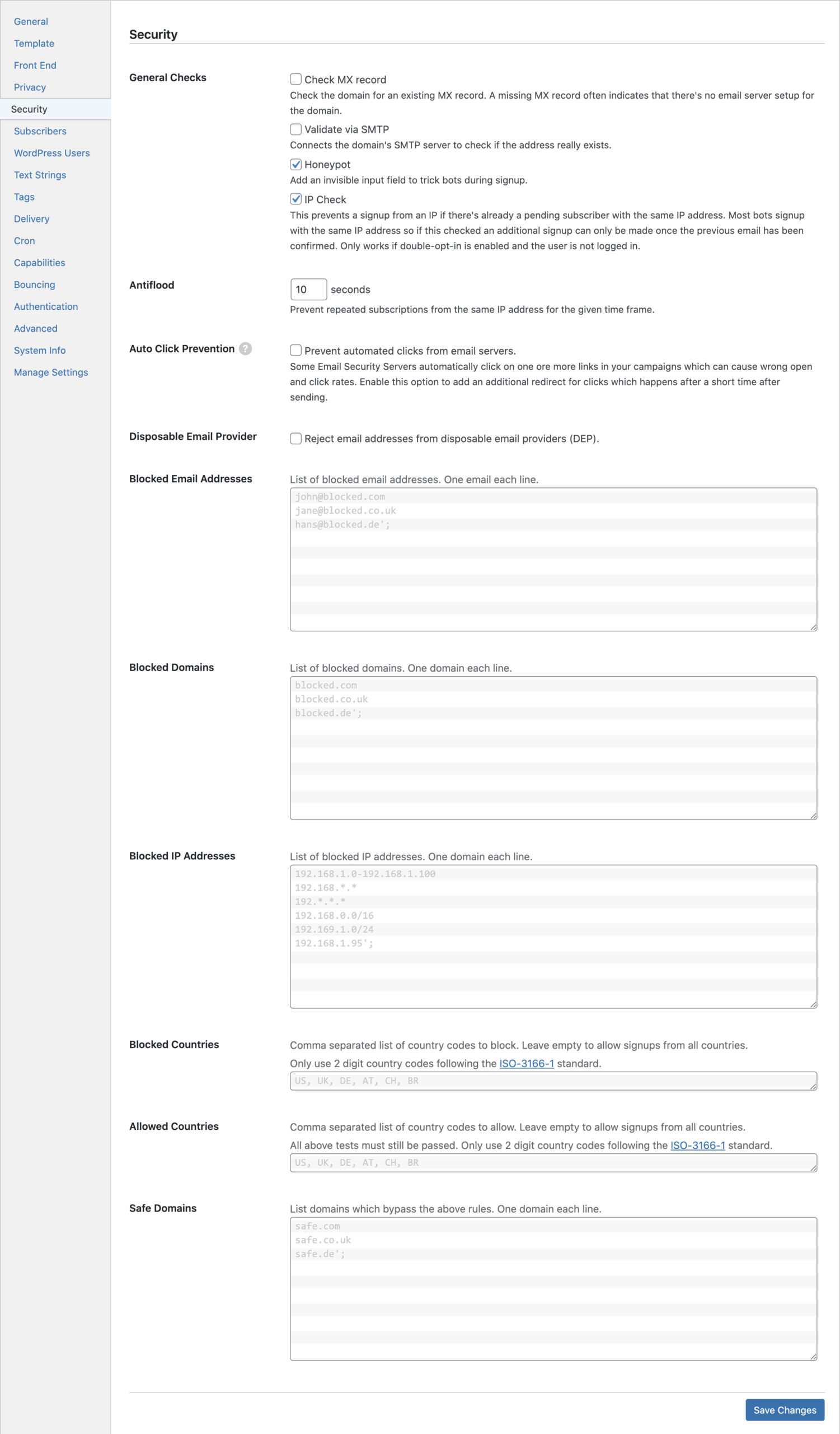 The Security Settings in Mailster allow you to safeguard your campaigns and signups by adding various layers of protection. Below is an overview of the available options and how to configure them.