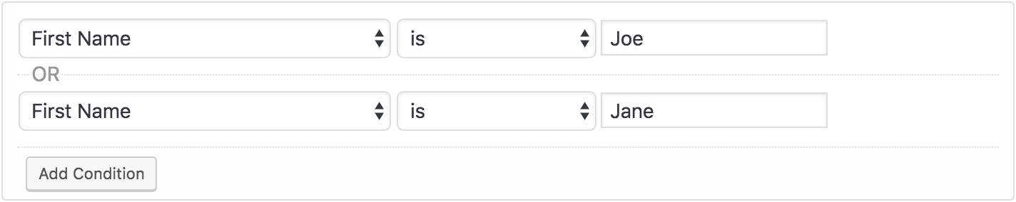 This OR connection targets all subscribers who have either “Joe” or “Jane” as their first name which targets Ms. Jane Doe as well Mr. Joe Doe.