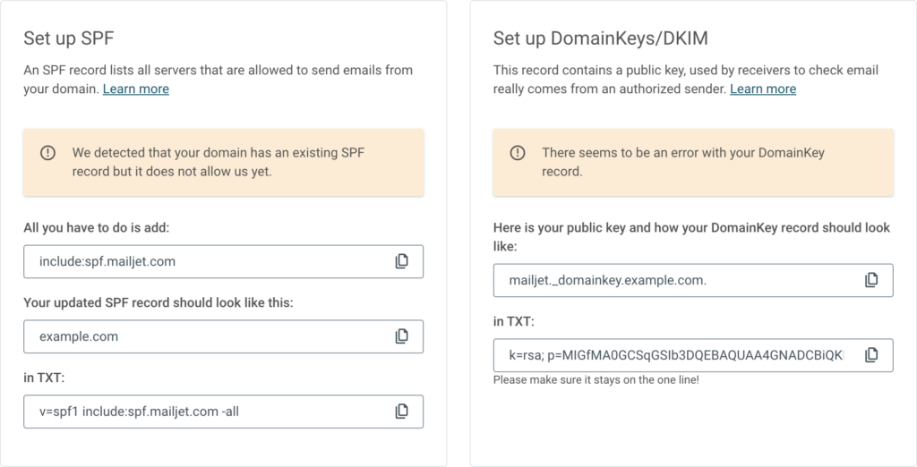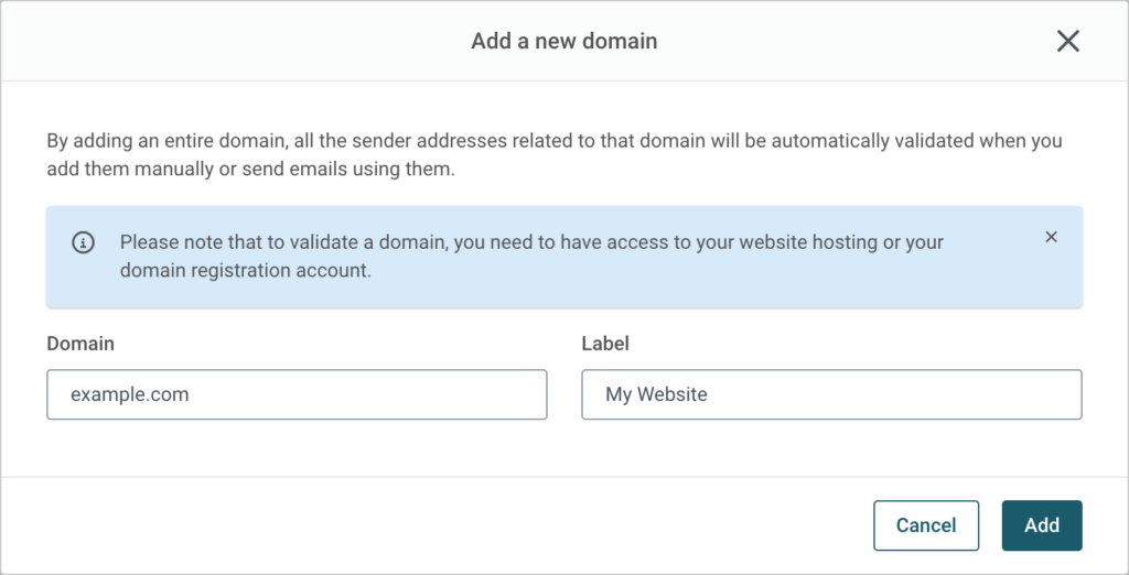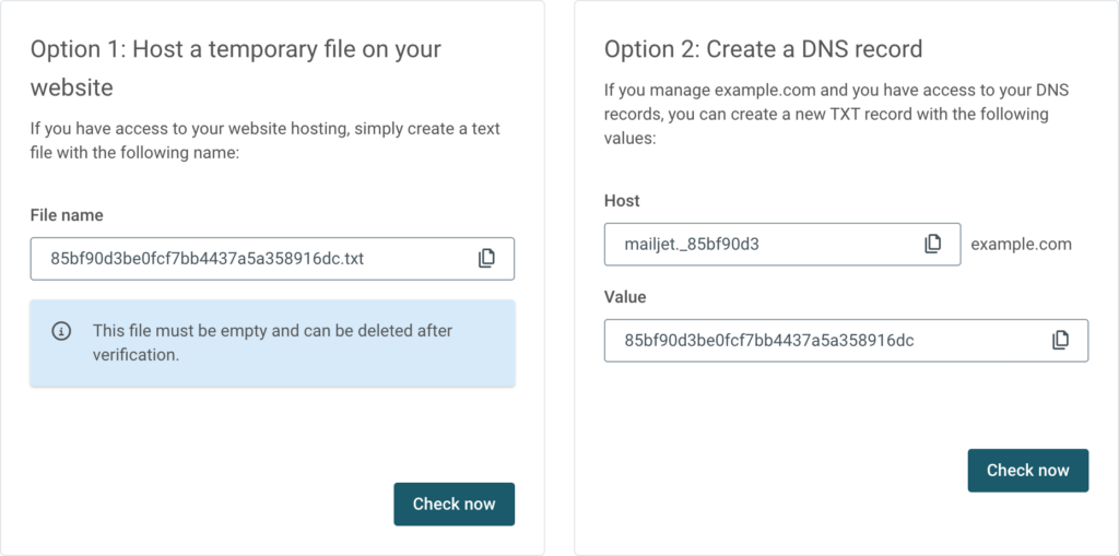 To send from your own domain Mailjet needs to verify you as the owner of your domain. You can alternatively verify a single email address if you don’t have access to your domain’s DNS settings.