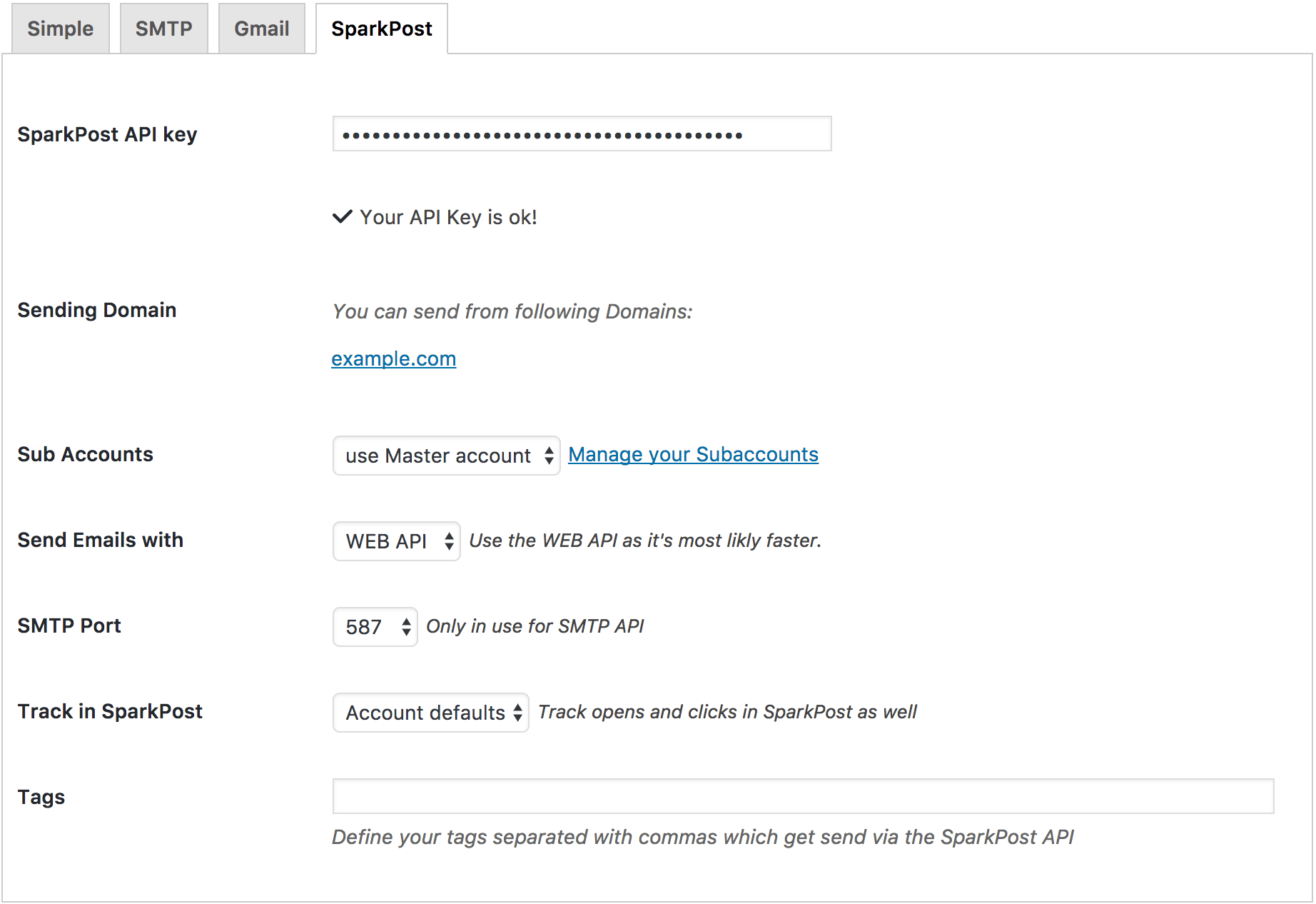 SparkPost has a WEB API and a SMTP API. If possible you should use the WEB API as it’s faster and returns better error messages. If it’s not possible you can go with the SMTP API too. Both offer the same functionality.