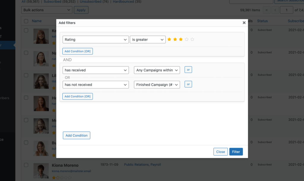 Next to the search function, you can filter your subscribers by applying conditions to them. Click on the “Filter” button on the top right of your subscriber’s overview page to reveal the filter modal.