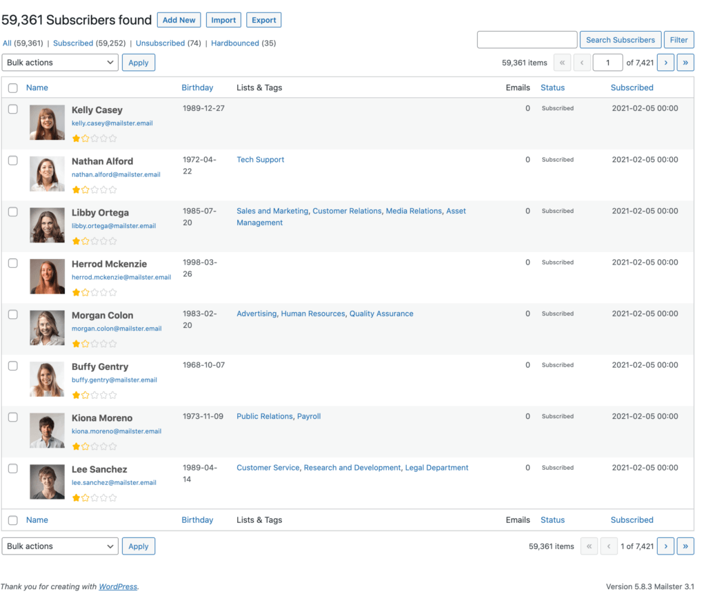 Mailster allows you to manage all your subscribers inside your WordPress installation. They are stored in tables in the same database as the regular WordPress tables.