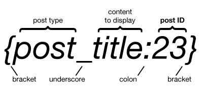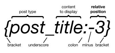 A dynamic tag is wrapped in brackets like the other tags and starts with the post type, followed by an underscore and the content to display. After a colon can be a negative integer like -3, which represents the third latest entry of the selected post type.