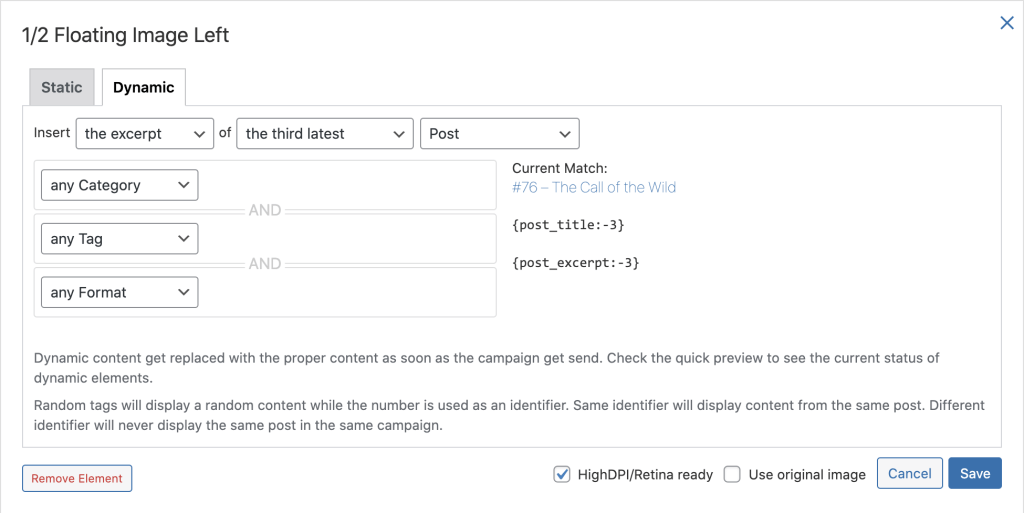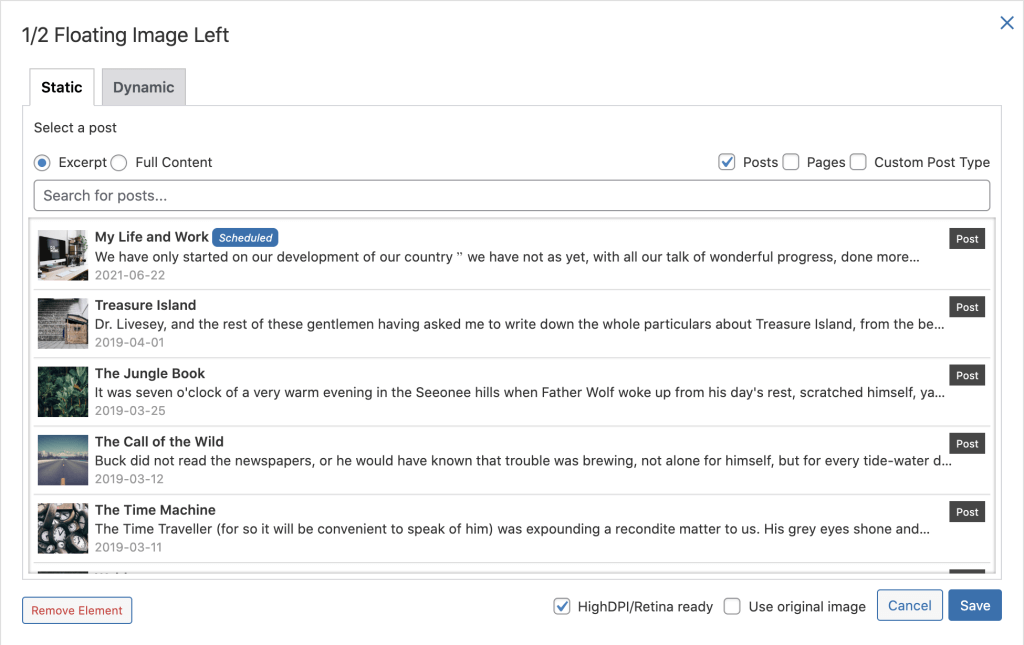 Some modules offer a button on the right side to insert whole posts including a headline, content, button with a link to the article, and feature images (if they exist).