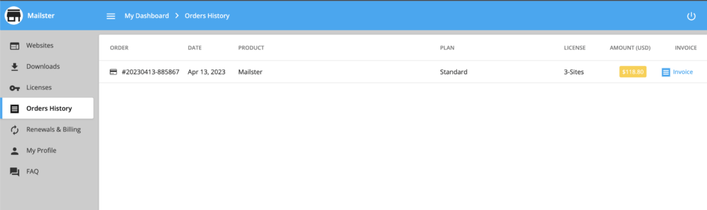 Once you’ve logged in successfully, navigate to the Orders History tab. From there, you can download an invoice for each payment by clicking on the blue invoice symbol labeled “Invoice”.