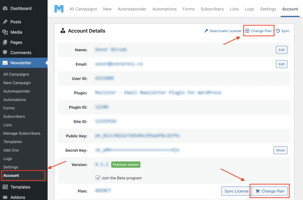 To up or downgrade your license from your WordPress Dashboard, click the “Account” page in the Newsletter menu and find the “Change Plan” button.
