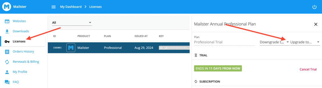 Find the option to either up or downgrade your license to a new plan or a different amount of sites.