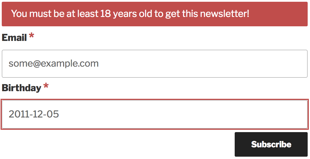 return new WP_Error( 'birthday', 'You must be at least 18 years old to get this newsletter!' );